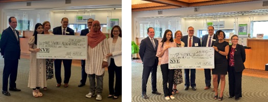 Pictured above left picture (left to right) are NVE employees Mike McCambridge, Chief Financial Officer, Stephanie Stagg, First Senior Vice Present Chief Credit Officer, John Spencer, Executive Vice President, Rob Rey, President, Lena Sung, Branch Manager Engle Street, and holding the check are 8th grade savings award recipients Laiba Abbassi and Raina Mirza.