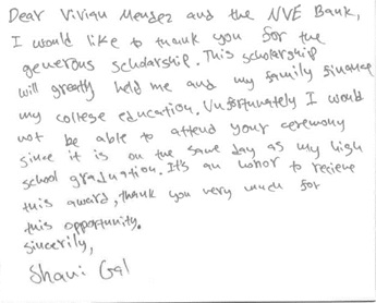 A thank you note sent to Vivian Mendez, NVE Branch Manager Cresskill from one of our scholarship recipients: